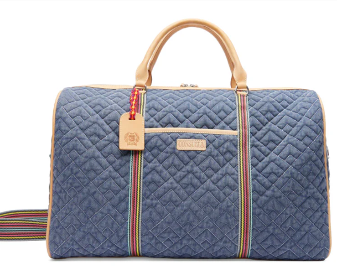 Our largest duffel style, the Weekender, is our go-to for weekend road trips. This duffel is roomy enough for all your essentials and features leather handles, an adjustable webbing strap, two interior pockets, and two exterior pockets. If you’re looking for a TSA carry-on compatible bag, check out the Jetsetter or the Zipper Tote!