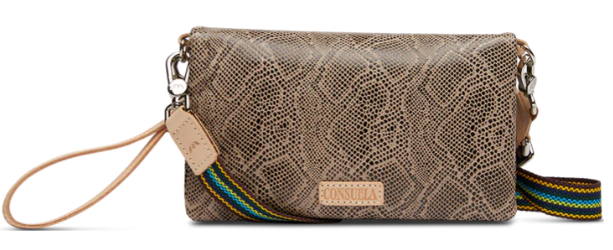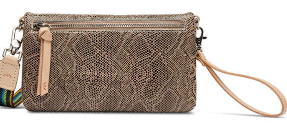 - Included detachable wristlet strap and adjustable woven crossbody strap