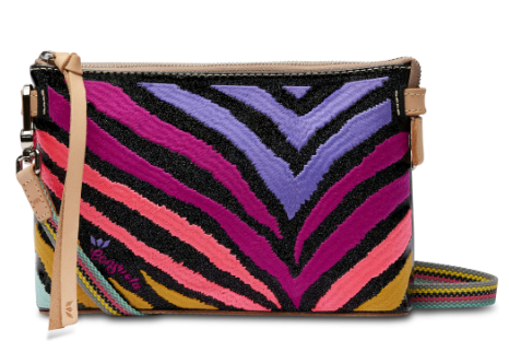 - Includes detachable and adjustable woven crossbody strap