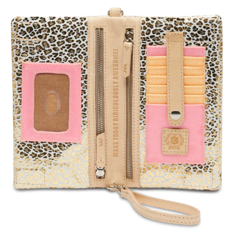 - Included detachable wristlet strap and adjustable woven crossbody strap