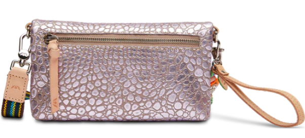 - Included detachable wristlet strap and adjustable woven crossbody strap