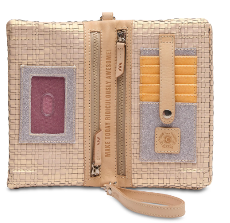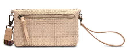 - Included detachable wristlet strap and adjustable woven crossbody strap