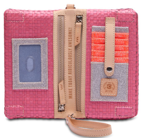 - Included detachable wristlet strap and adjustable woven crossbody strap