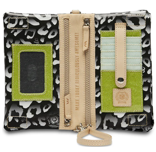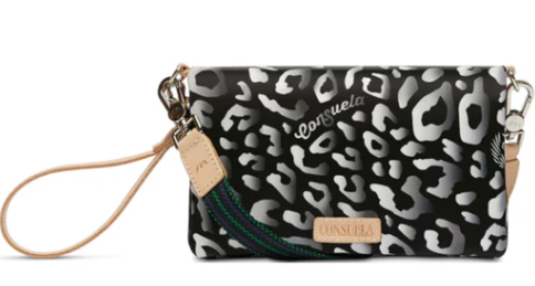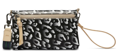 - Included detachable wristlet strap and adjustable woven crossbody strap