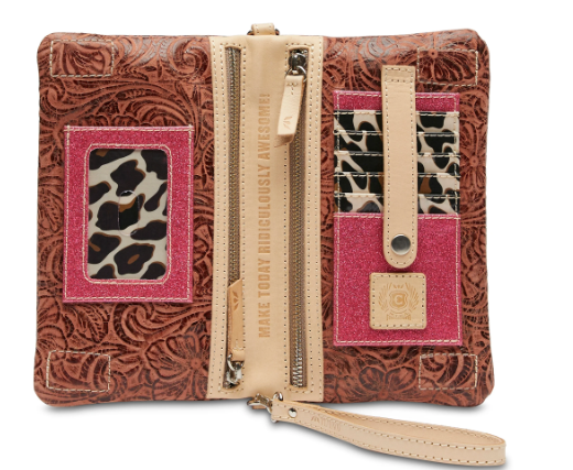- Included wristlet strap and adjustable crossbody strap