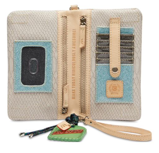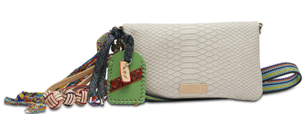 - Included detachable wristlet strap and adjustable woven crossbody strap